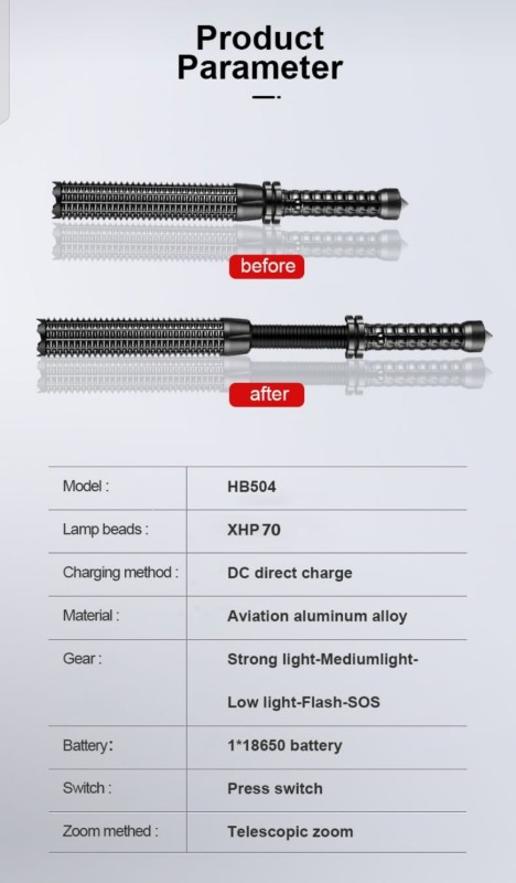 عصا الالمونيوم بكشاف LED قوي للدفاع عن النفس قابله للشحن