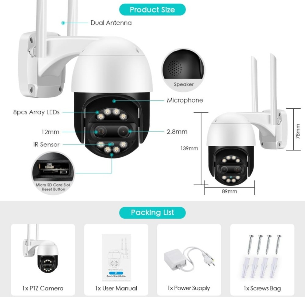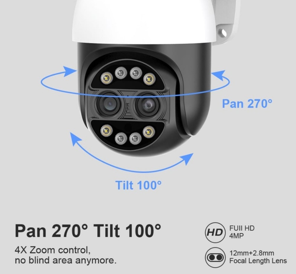 تعمل بالوايفاي اوبدونه وايضا يمكن توصيلها بكيبل نت ودقة التصوير عالية 8 ميغا بكسل ودقة عرض - 4K و مع زووم بصري 8 يقوم بتقريب ابعدددد الأشياء ورؤية ليليه ملونه لمسافة 100 متر واكثر.