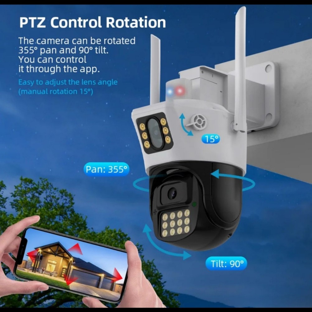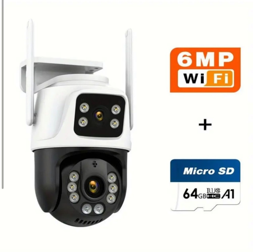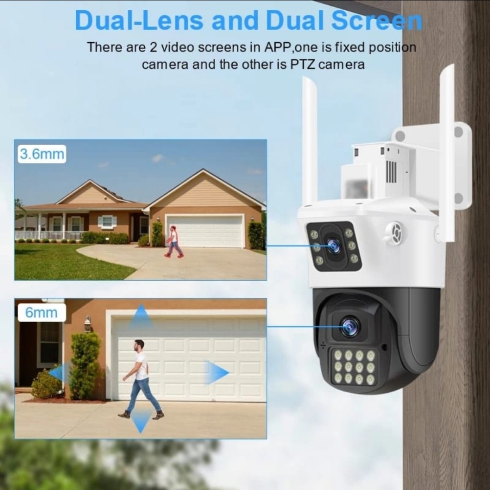 عدسة ثابته وعدسة ثانيه توجهها على اي زاويه ثانيه ومتحركه يمكنك التحكم بها وتصور جميع الاتجاهات 360 درجه منتظمة بتاريخ والوقت والتسجيل اتمتيكي ، تعمل بالواي فاي ويمكنك التحدث مع الأشخاص بجانب الكيمرا ومشاهدة التسجيلات من اي مكان بالعالم أو حتى بدون نت من مسافة 20 متر وتشاهد مباشر من الجوال