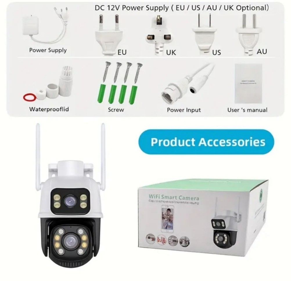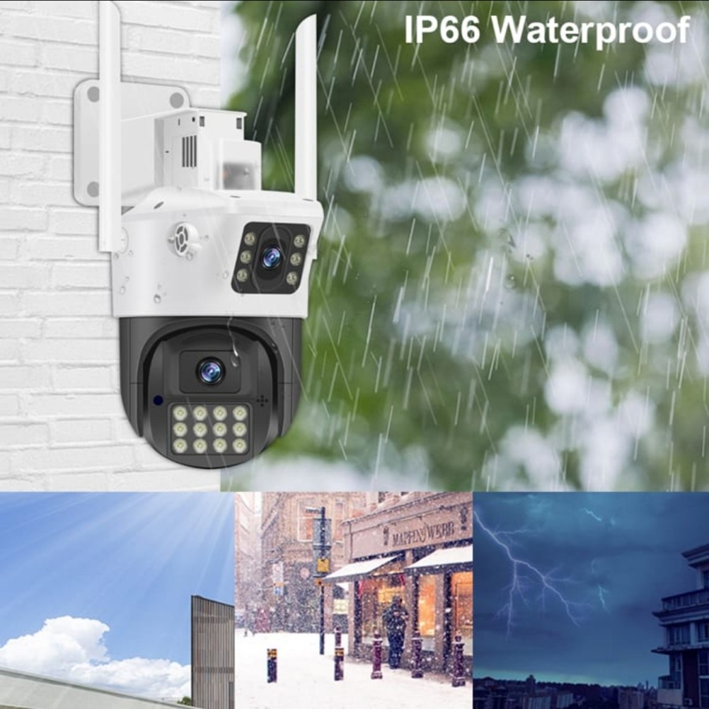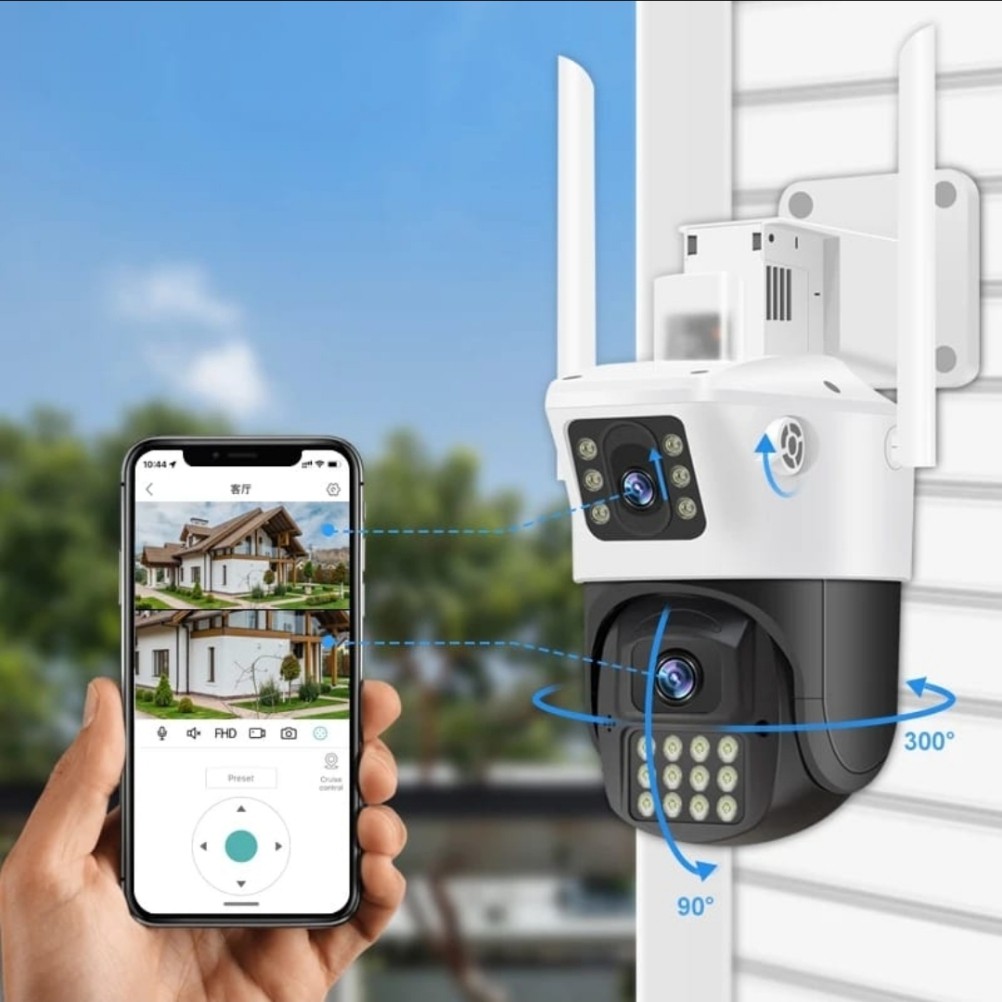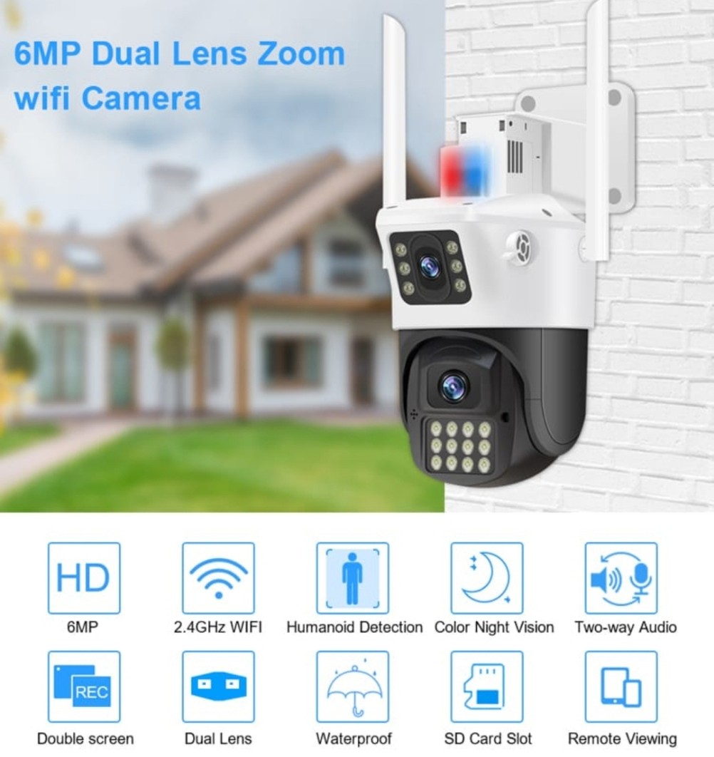 عدسة ثابته وعدسة ثانيه توجهها على اي زاويه ثانيه ومتحركه يمكنك التحكم بها وتصور جميع الاتجاهات 360 درجه منتظمة بتاريخ والوقت والتسجيل اتمتيكي ، تعمل بالواي فاي ويمكنك التحدث مع الأشخاص بجانب الكيمرا ومشاهدة التسجيلات من اي مكان بالعالم أو حتى بدون نت من مسافة 20 متر وتشاهد مباشر من الجوال