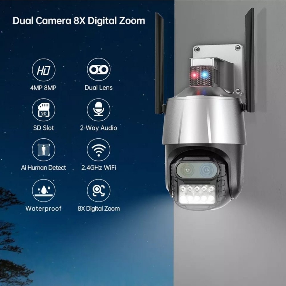 تعمل بالوايفاي اوبدونه وايضا يمكن توصيلها بكيبل نت ودقة التصوير عالية 8 ميغا بكسل ودقة عرض - 4K و مع زووم بصري 8 يقوم بتقريب ابعدددد الأشياء ورؤية ليليه ملونه لمسافة 100 متر واكثر.