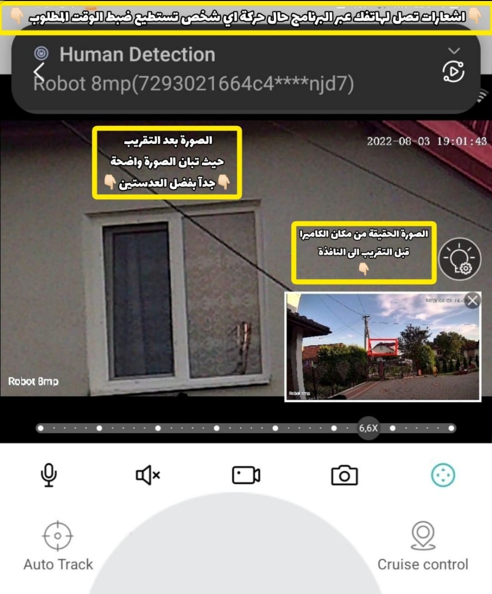 تحتوي ع كشاف يحساس للحركة ليقوم بالاضائة ليلا حال حركة اي شخص لتصوير اوضح ... كما تقوم باصدار انذار صوتي وضوئي لتخويف الشخص حيث يمكنك ضبط وقت تشغيله بجوالك
