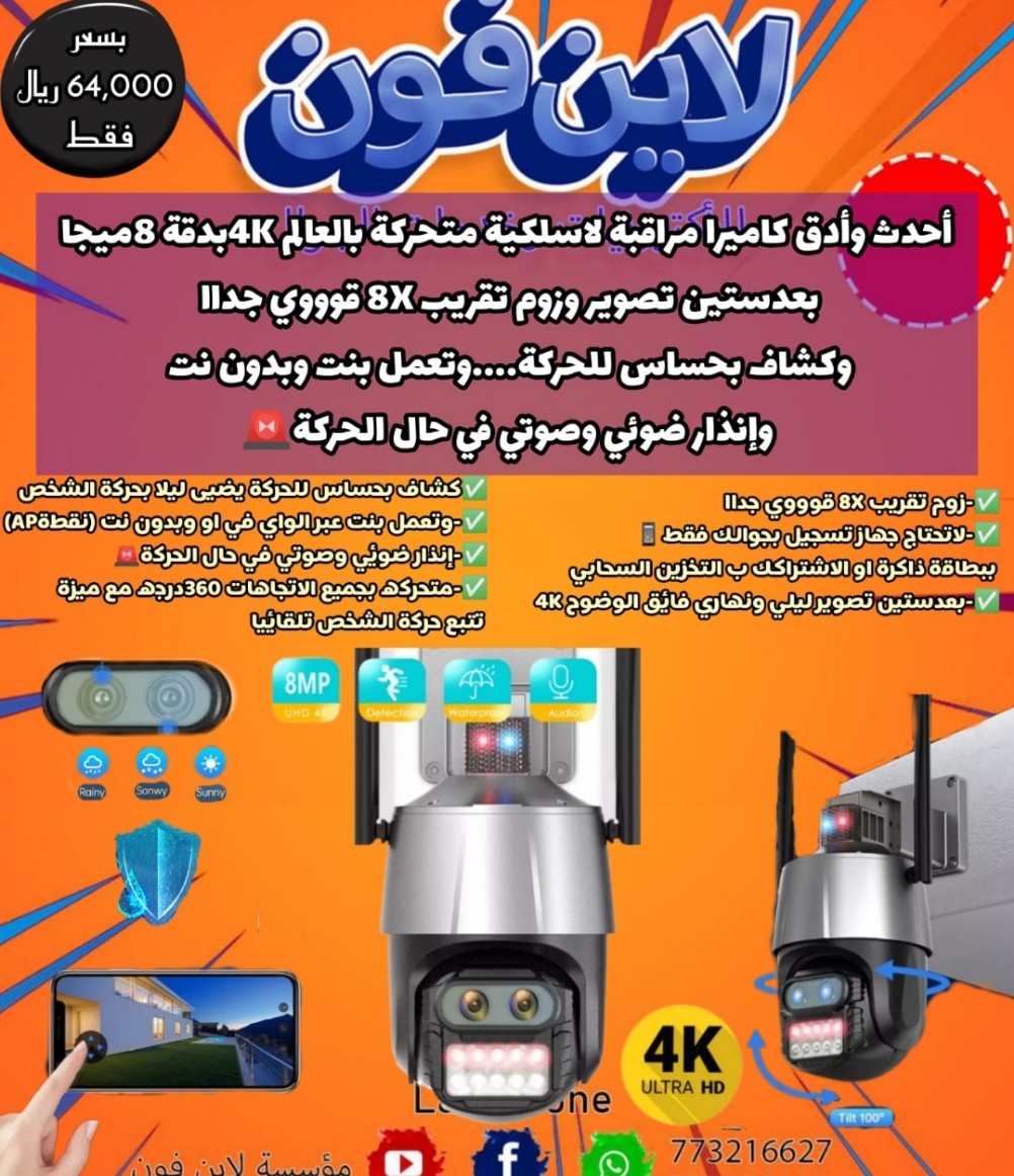 لأول مرة ب #اليمن أأحدث وأدق كاميرا مراقبة لاسلكية خارجية متحركة 360 - بالعالم بعدستين تصوير فائق الوضوح 4K وبدقة 8 ميجا وزوم تقريب 8 وكشاف حساس وجهاز انذار وتحكم بالجوال -