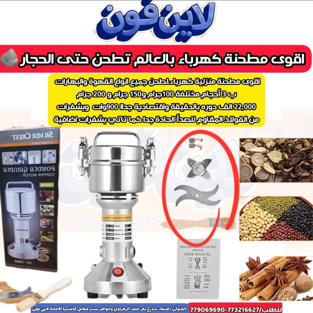 أقوى مطحنة كهربائية تطحن الحجار ولطحن جميع انواع القهوة والبهارات 22,000 الف دوره بالدقيقة من شركة Hoffmana العالمية وقالبة لدوران 270 درجة وبشفرات من الفولاذ المقاوم للصدأ الحادة جدا ومع مؤقت للتشغيل كما تاتي بشفرات اضافية وهيكل من الفولاذ المقاوم للصدأ سهلة الاستخدام خلال اقل من دقيقة فقط لدى مؤسسة #لاین_فون