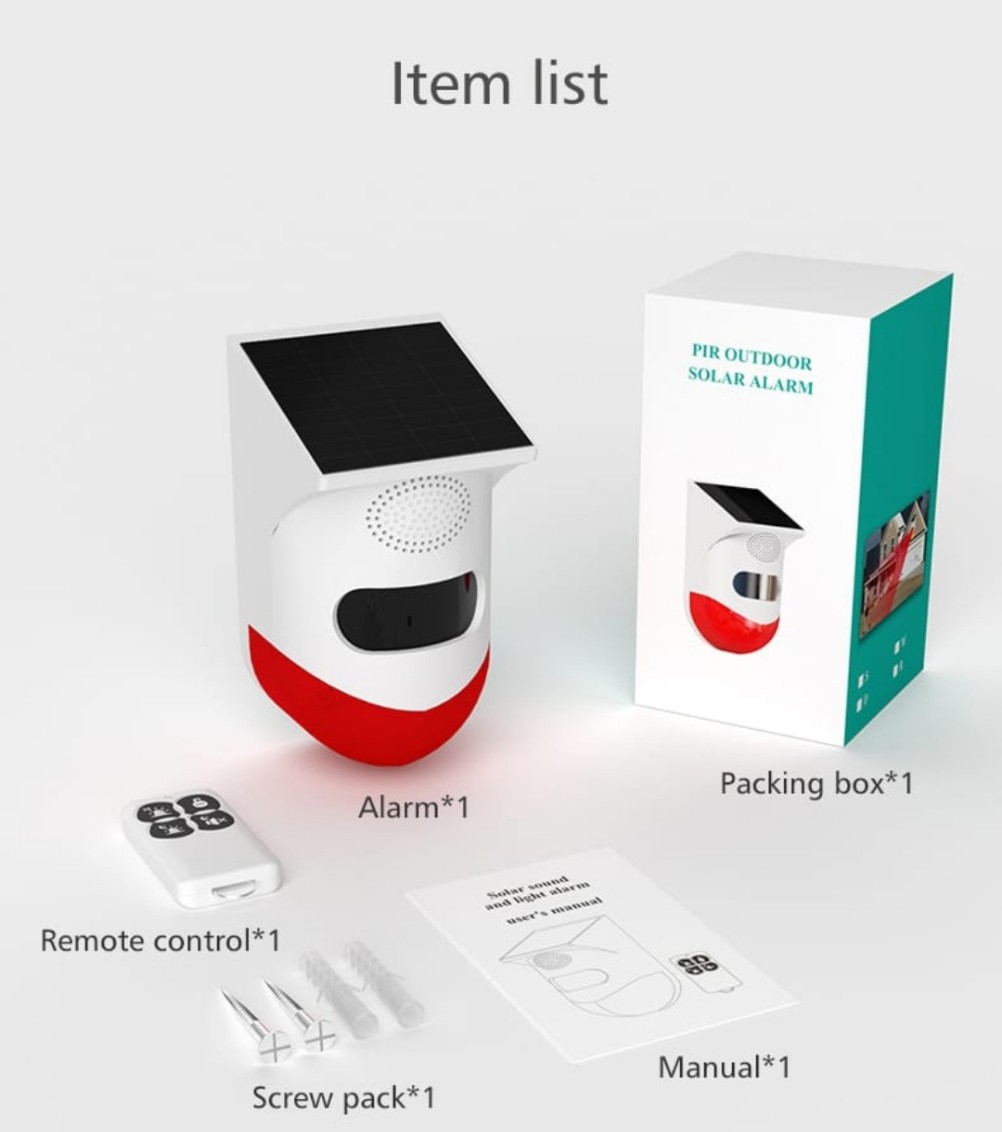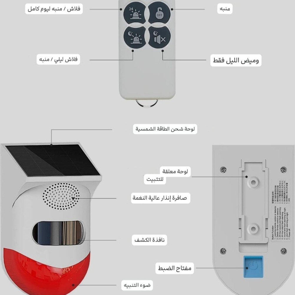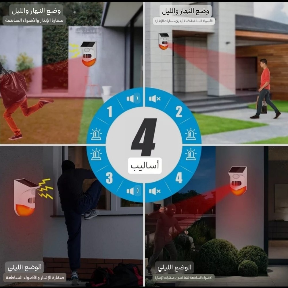 جهاز إنذار صوتي وضوئي بحساس حركه 15 متر يشحن بشمس بريموت تحكم ليعمل بالنهار والليل
