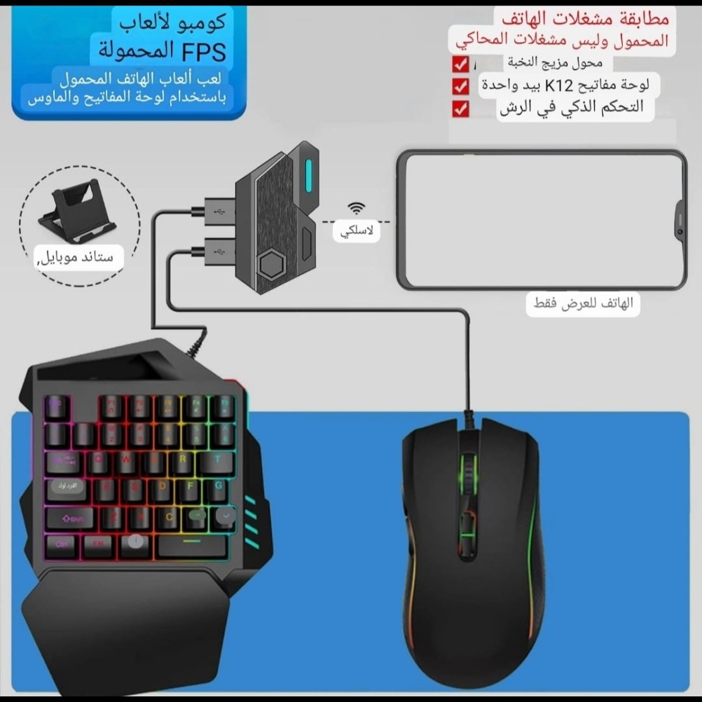 حصريااا باليمن - استمتع بلعب احترافي بجوالك او ایبادك او حتى كمبيوترك وبدون حظر مع مجموعة الكيبورد والماوس المضيئ الاحترافي + قطعة التشغيل (لا سلكي) بدون اسلاك بلوتوث + استاند لتثبيت للجوال معا إمكانية شحن الجوال اثناء اللعب واللعب بحرية