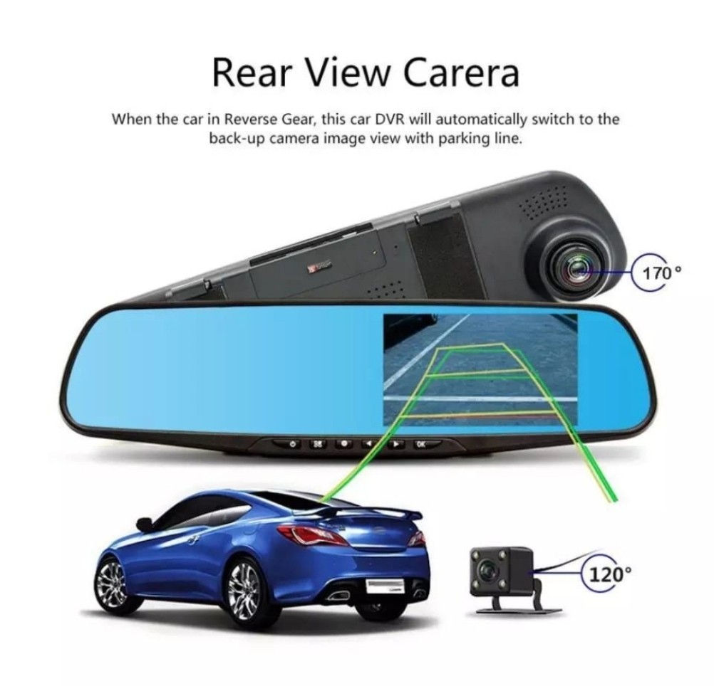 مع كاميرا أمامي وخلفي وبشاشة مخفيه ع المرايه للحمايه من السرق ولتستيطع مراجعة التسجيل وحفظة بسهوله وايضا تعمل حتى بانطفاء السيارة ويمكن استعمالها للرؤية اثناء الرجوع للخلف بربطها مع السيارة