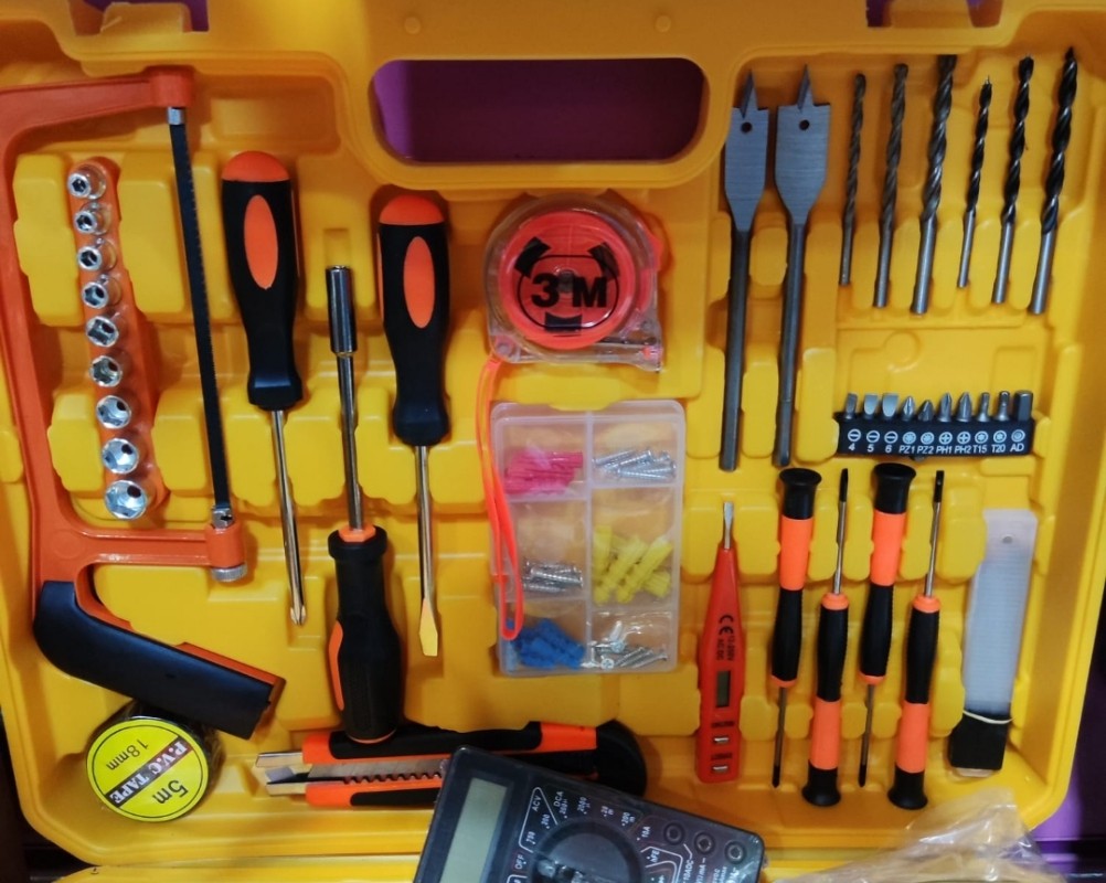 شريط عازل -1- مجموعة مآخذ سداسي × 8- قلم اختبار كهرباء × 1- مقياس رقمي متعدد -1 مثقب حلزوني × 3 مجموعة براغي 95 قطع Approved