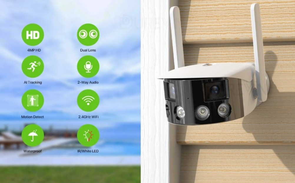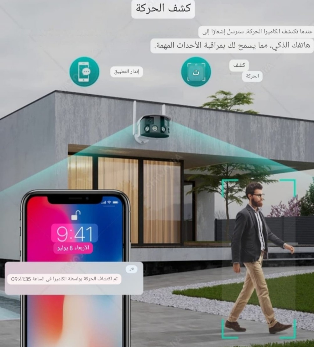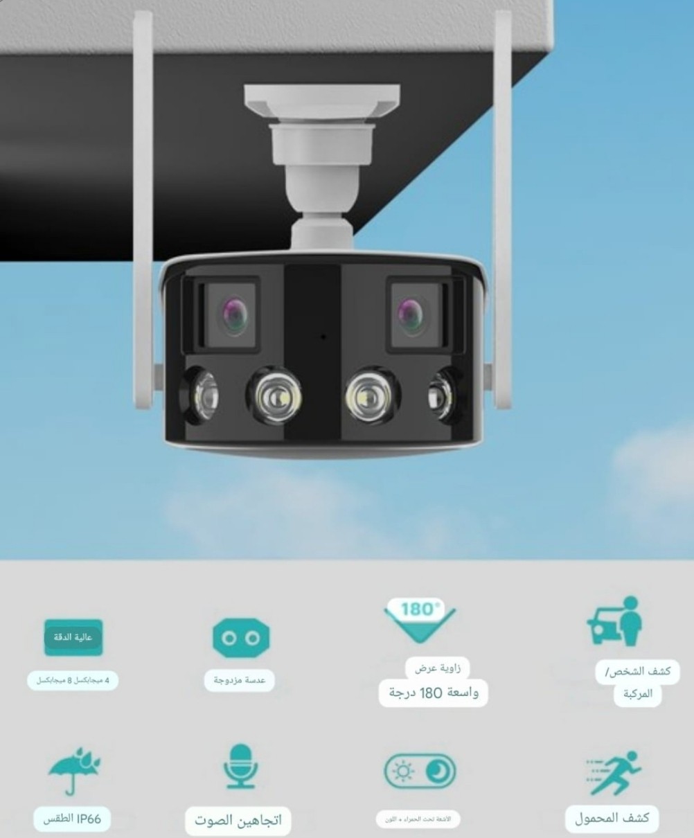 أحدث كاميرا خارجية تصور مقابلها من اقصى اليمين لليسار وبكشاف وانذار حساس للحركة واخافة السرق قبل الحادثة وخاصية التقريب زووم بصري 4x ورؤية ليليه المسافة 50 متر