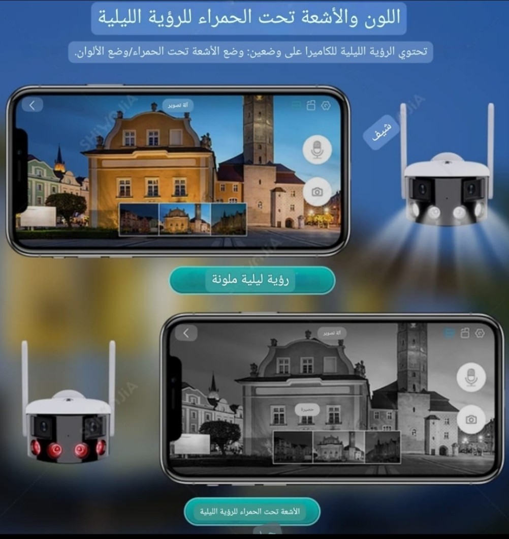 بـ4 كشافات ليد - يمكنك التحكم بتشغيلها عند حركه الاشخاص ليلا لتصوير ملون ط والأشعة تحت الحمراء وميكرفون للتحدث واستماع الأشخاص بجانب الكاميرا
