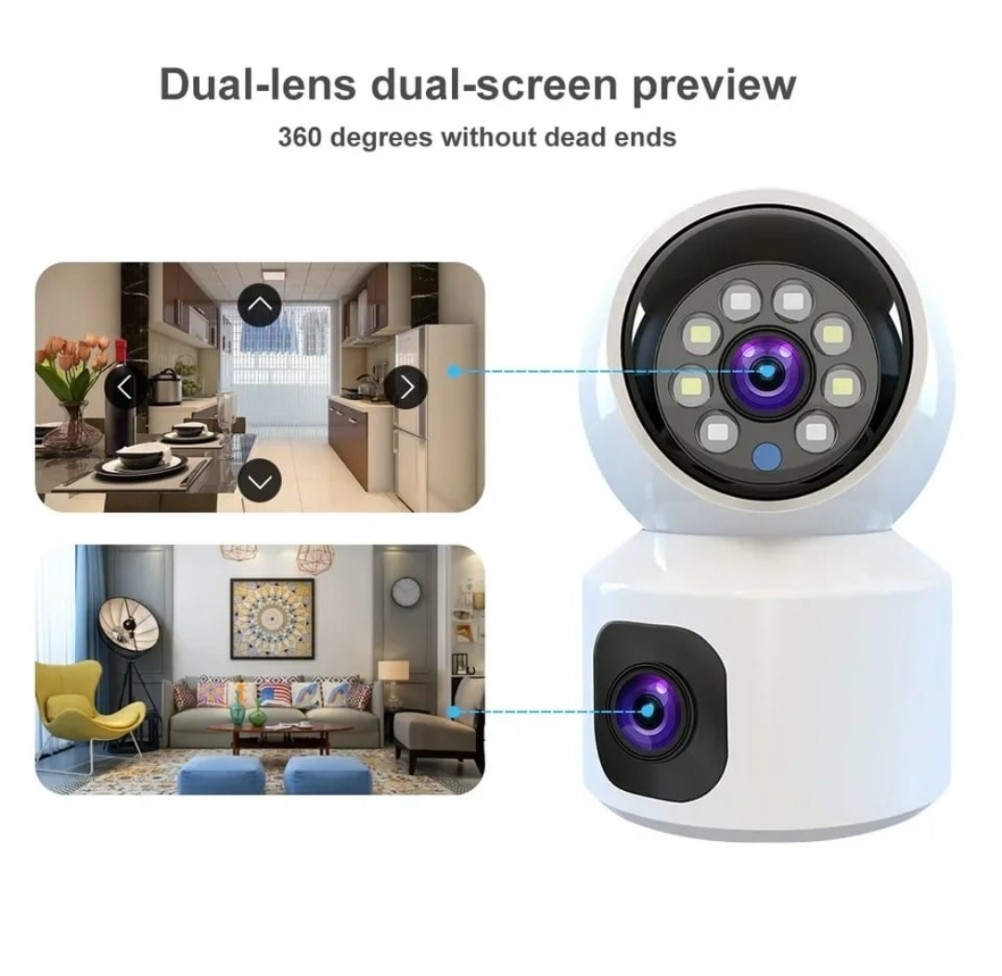 عدسة ثابته وعدسة متحركه تصور جميع الاتجاهات 360 درجه ، منتظمة في تاريخ والوقت والتسجيل اتمتيكي بدون الحاجة الى ضبط متواصل ، تعمل بالواي فاي ويمكنك التحدث مع الأشخاص بجانب الكيمرا ومشاهدة التسجيلات من اي مكان بالعالم أو حتى بدون نت من مسافة 20 متر