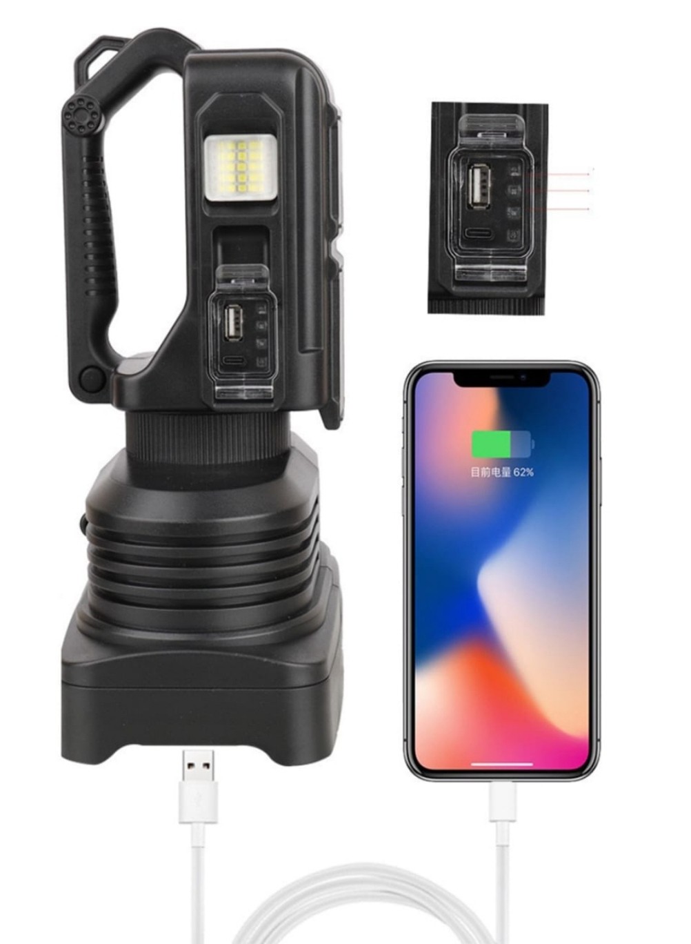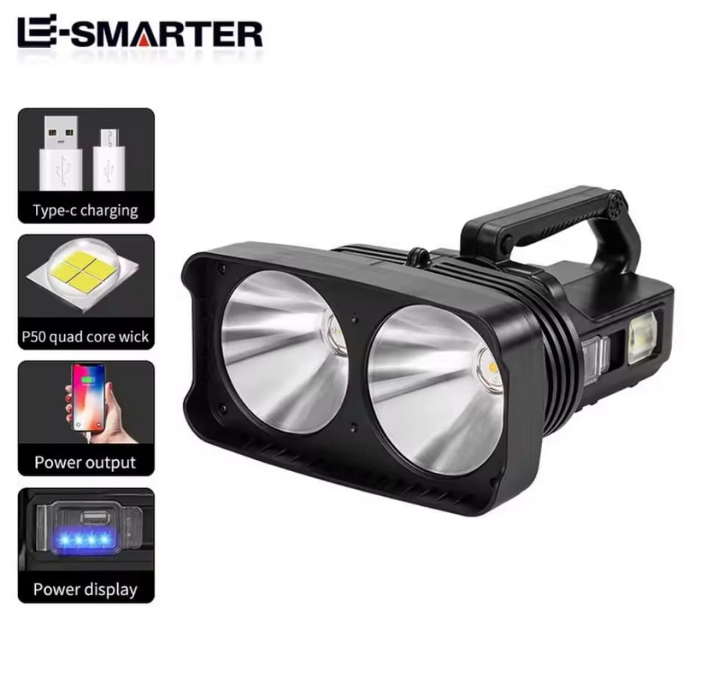 كشاف يد شحن الوحش 2 عيون led ومخرج شحن للجوال usb واضائة جانبي وحزام