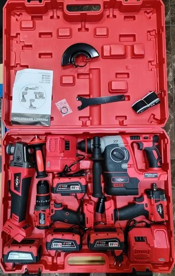 * المحتويات: دريل (مثقاب)، منشار، صاروخ، مفك، بطاريات إضافية، شاحن، وحقيبة.